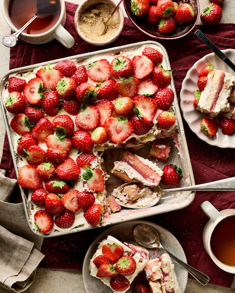 Een aardbeien tiramisu is ook een echt feestelijk dessert tijdens de feestdagen. Met zijn prachtige lagen van rode aardbeien, romige mascarpone en lichte lange vingers oogt het niet alleen elegant, maar smaakt het ook heerlijk luchtig en fris. Voeg een klein beetje sparkle toe met eetbare bloemen of een vleugje goudpoeder, en je hebt een dessert dat niet alleen de harten van je gasten verovert, maar ook prachtige fotoās oplevert voor herinneringen die blijven hangen.