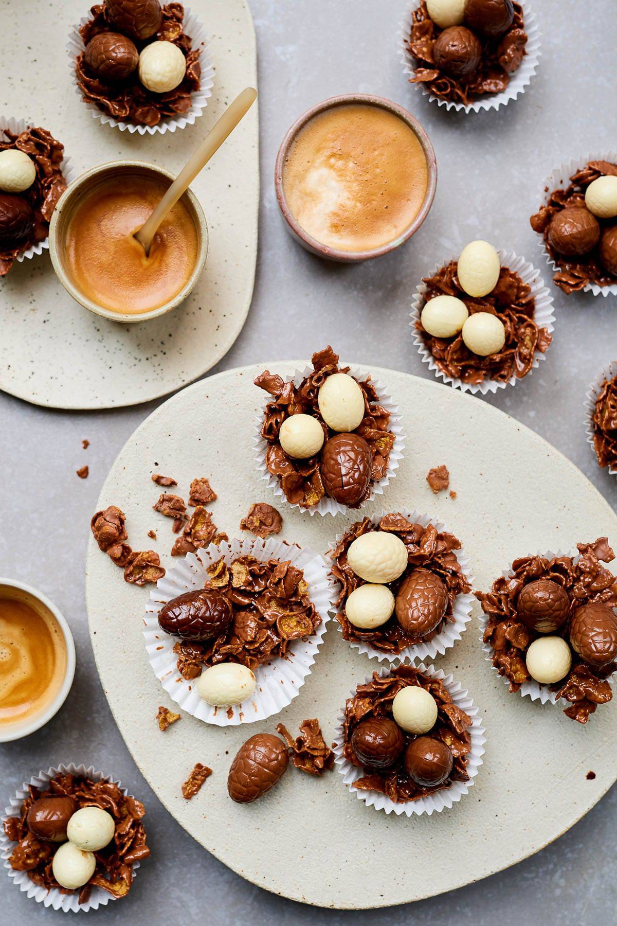 - Verdeel de cornflakes over cupcake papiertjes en maak een holletje in het midden voor het ānestjeā. Doe drie eitjes per nestje erin.