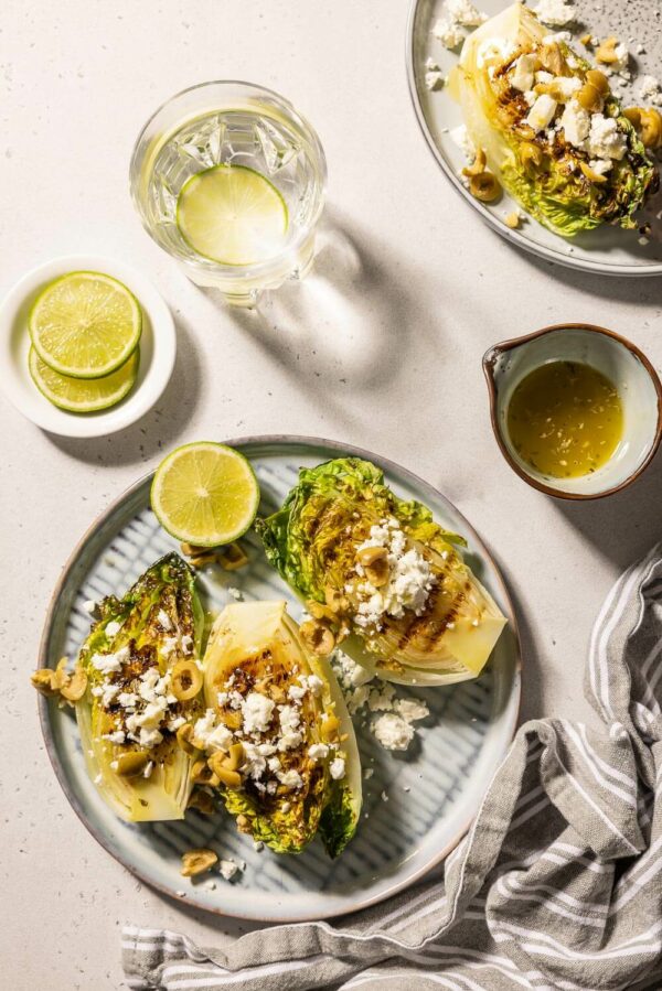 Die gegrilde sla kun je daarna afmaken met smaken naar keuze. In dit gerecht ga ik voor een combinatie van oregano, feta en olijven. Je kunt ook een beetje de Mexicaanse kant op, met bijvoorbeeld zwarte bonen, puntpaprika, mais en avocado. Of meer Italiaans, met burrata, citroenrasp, olijfolie en basilicum. Mogelijkheden genoeg!