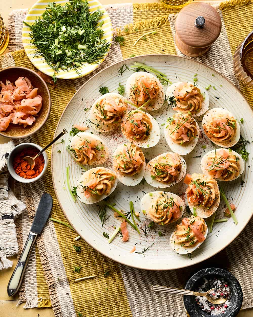 Gevulde eieren maken is een klassieker waar je nooit mis mee kunt gaan, zeker niet met deze elegante touch van romige zalm. Begin met perfect gekookte eieren: zachte, goudgele dooiers die je mixt met een flinke dot zachte roomkaas, citroenrasp, een snufje peper en natuurlijk die fluweelzachte zalm. Door de zalm door de vulling te vouwen krijgt elk hapje een zee‑frisse, luxe twist die perfect past bij een vrolijke paasbrunch. Het mooie van dit gevulde eieren recept is dat het zowel simpel als stijlvol is: je hebt maar een paar ingrediënten nodig, maar het resultaat ziet eruit alsof je uren in de keuken hebt gestaan. En dat stukje zalm? Dat tilt het klassieke paasgerecht meteen naar een feestelijk niveau.