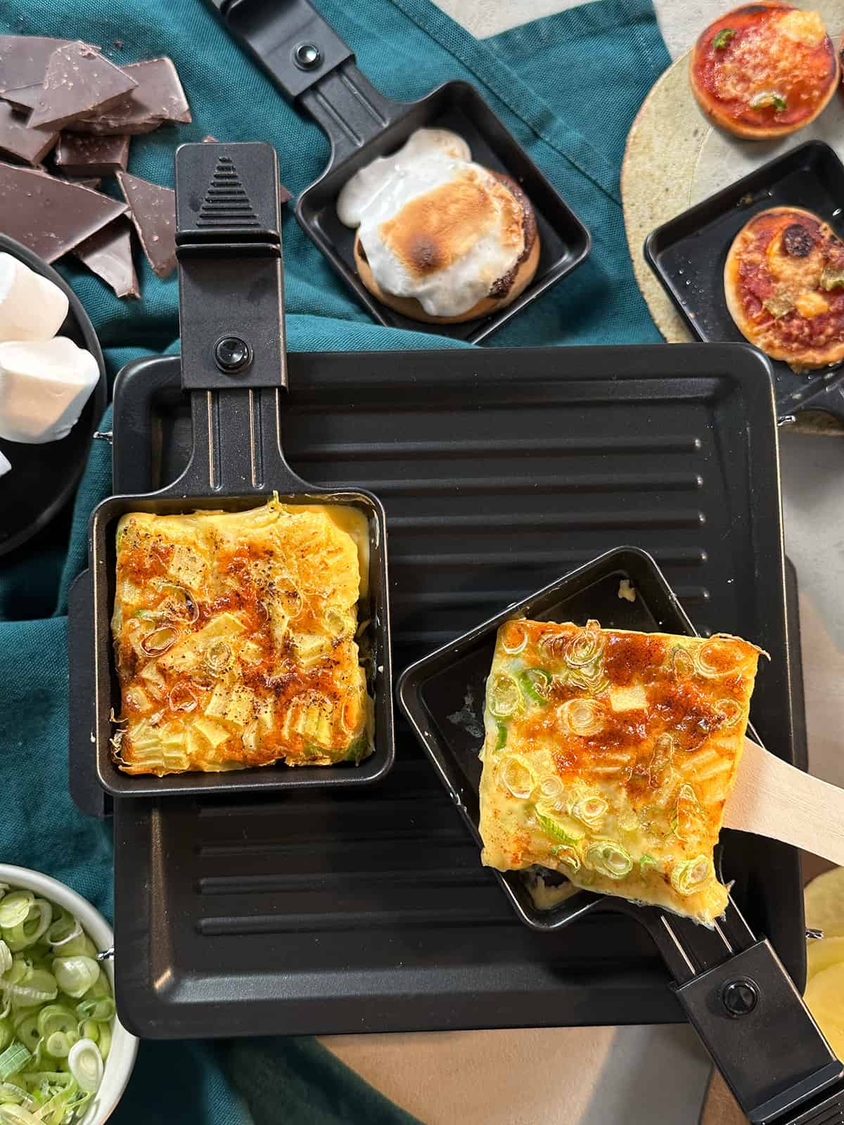 - Vet een gourmetpannetje in en verdeel wat kleingesneden aardappelblokjes en wat bosui over de bodem. Schenk wat van het eimengsel er over en laat de aardappeltortillaās ca. 8 minuten stollen en bakken.