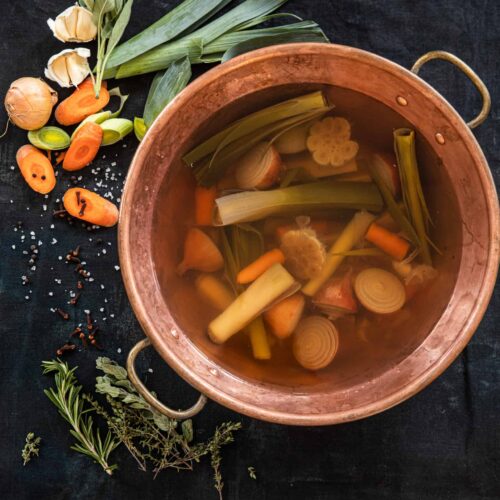 Het lekkerste van een bouillon is als je die ook helemaal zelf gemaakt hebt. Een bouillonblokje op zijn tijd moet natuurlijk kunnen, maar bedenk wel dat daar heel veel smaakmakers en zout in zitten. Vandaar dat ik hier een groente recept met je deel dat je helemaal zelf kunt maken. Een zelfgetrokken bouillon zit namelijk vol goede stoffen. Het helpt je je immuunsysteem verbeteren, is goed tegen cellulitis en heeft een geweldige umami-smaak. Ken je de kippenbouillon nog van je oma als je ziek was vroeger? Dit recept is dan ook een natuurlijke penicilline voor je. Zelf bewaar ik altijd alle karkassen en schillen om daar zo een keer in de week een heerlijke bouillon van te trekken. Nog een extra tip van mij: Als je de kipkarkassen weglaat, verdubbel je de hoeveelheid groenten. Doe er ook 2 pastinaken bij en laat maar 20 minuten koken. Anders wordt de groentebouillon te sterk. Wil je nog meer weten over: Bouillon maken: tips, trucs en toepassingen!