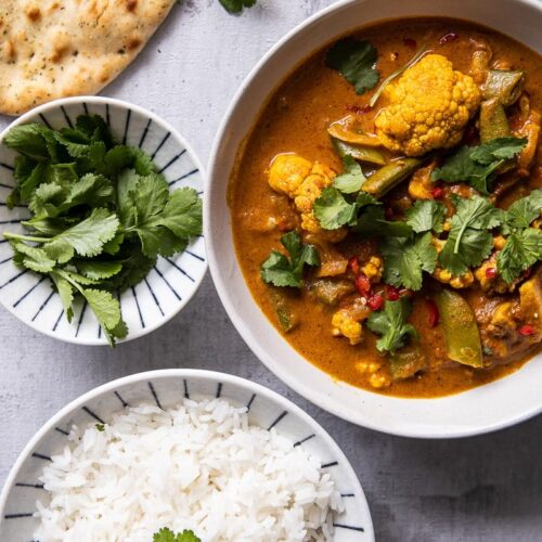 - Serveer de curry met de rijst en de zoetzure komkommer en verse koriander.