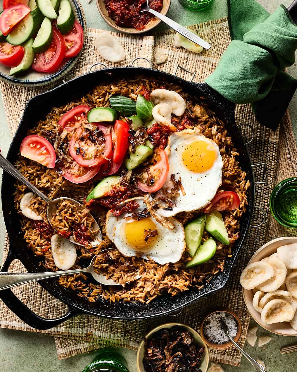 - Verdeel de rijst over 4 borden. Leg op elk bord een spiegelei. Verdeel de gebakken uitjes, komkommer en tomaat over de borden en serveer met sambal.Â