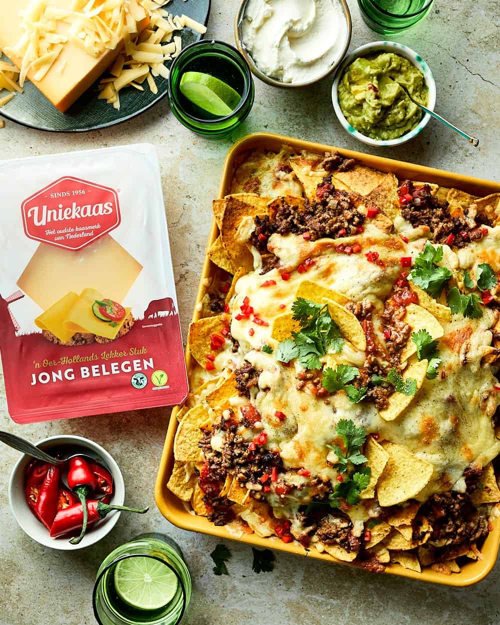 - Leg de nachos op een ovenschaal, doe het gehaktmengsel erbovenop en maak af met de geraspte jong belegen Uniekaas. Doe de nachos’s 20 tot 25 in de oven op 190 graden.