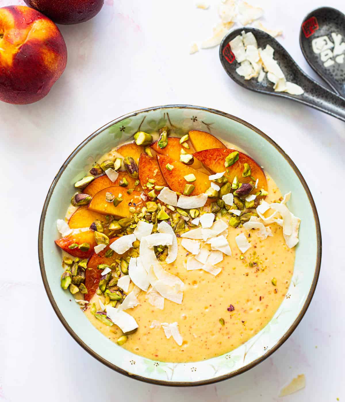 - Schenk in twee kommen en beleg met plakjes nectarine, de gehakte pistache nootjes en kokosflakes. Serveer meteen.