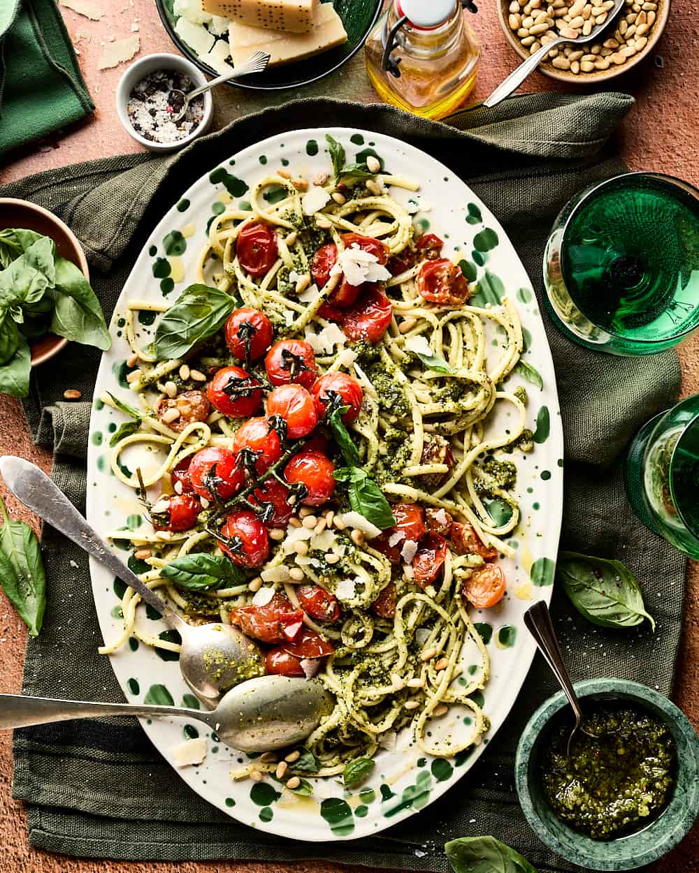 Pasta pesto is een van de snelste pasta’s die ik ken. Je hebt maar een handje aan ingrediĆ«nten nodig. Moeilijk om te maken is het zeker niet, maar vergeet je keukenmachine niet. Die kun je goed gebruiken. Als je het echt wil eten zoals ze het in LiguriĆ« doen, eet je de pesto met de pastasoort trofie ā maar je ziet het ook vaak met trenette, fettuccine of fusilli. Ik trek in dit recept lekker mijn eigen plan en kies voor linguine. Maar welke soort pasta je gebruikt is up to you: het recept blijft verder gewoon hetzelfde. Wil je nu echt een pasta van hoge kwaliteit op tafel zetten? Maak dan jouw pastadeeg zelf. Het is helemaal niet zo moeilijk als je denkt. Kijk maar eens naar dit recept, een eitje toch?!
