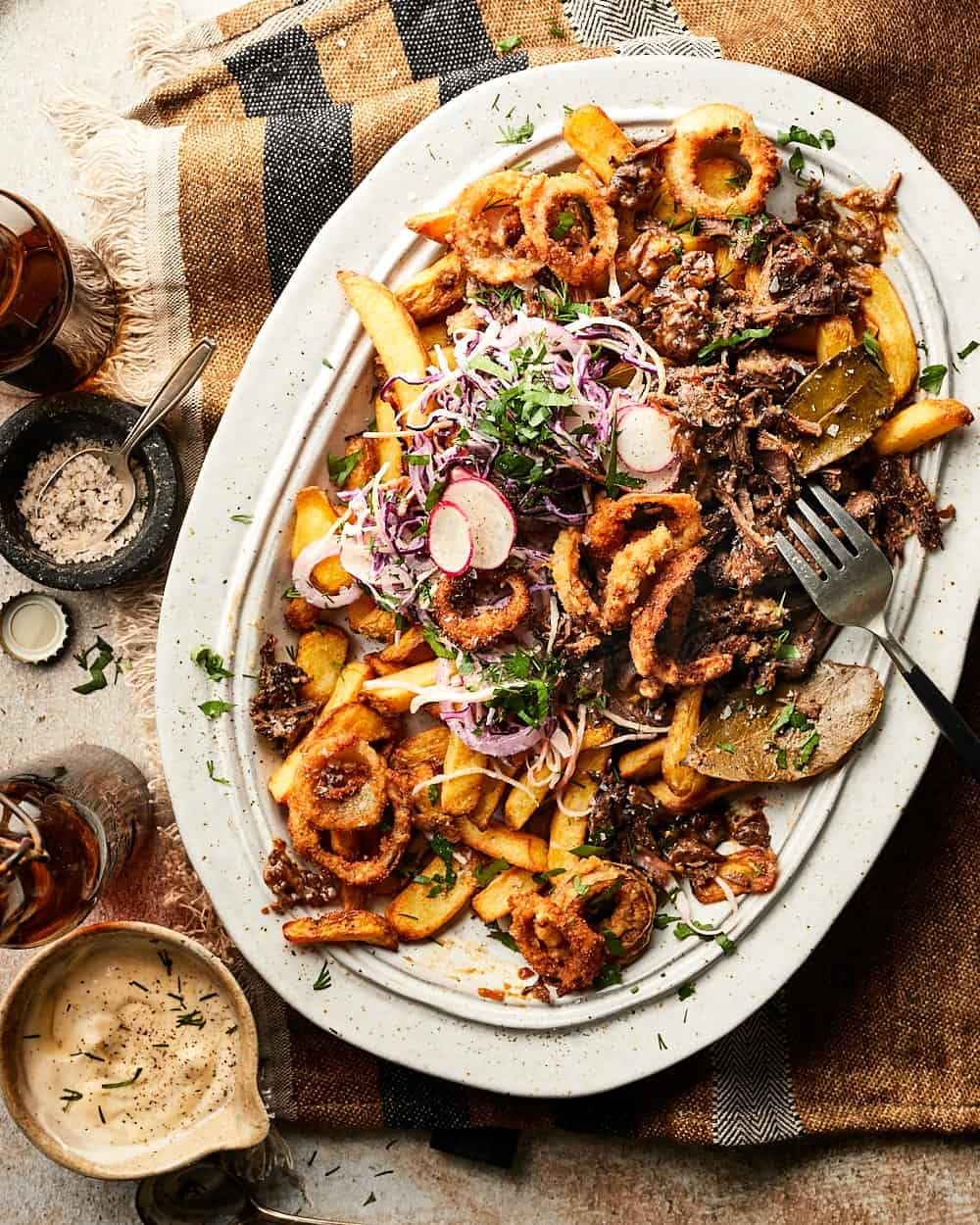 - Schep de patat op de borden, verdeel het stoofvlees over de patat. Top af met coleslaw en de knapperige uienringen.