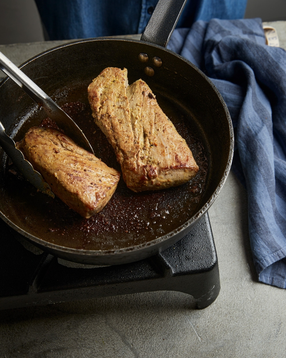 - Schroei de varkenshaas rondom dicht: ongeveer 1, 2 minuten per kant, totdat het mooi bruin is. Gebruik een tang! Prik niet in het vlees, dat laat sappen ontsnappen.