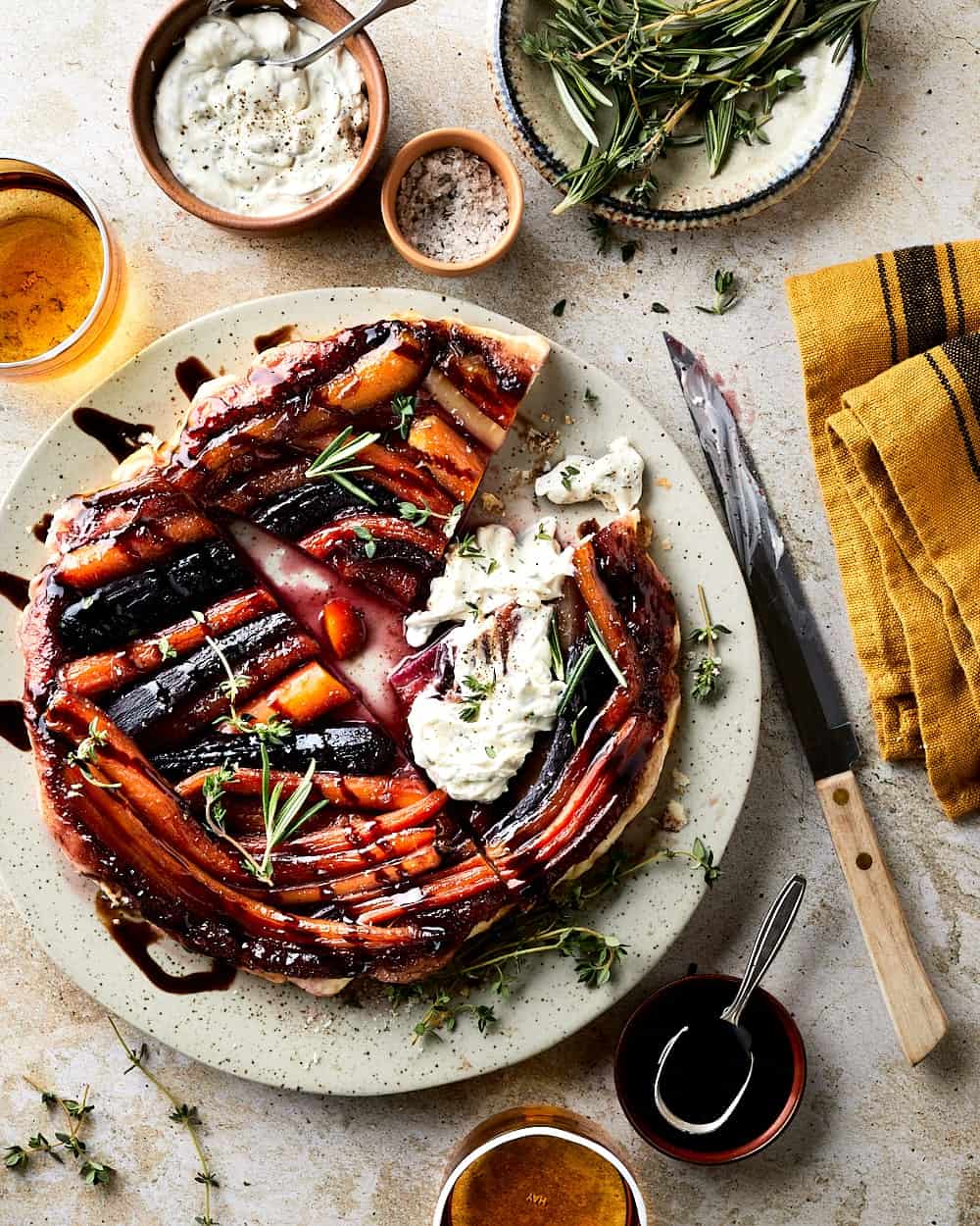 Nu heb ik het heel heel de tijd over appels, maar toch is dit een recept met wortels. De tarte tatin kan je met van alles maken, zo ook wortels. Wortels brengen een subtiele zoetheid en een interessante textuur die perfect samengaat met de karamel en het krokante deeg. Bovendien zitten ze boordevol vitamines en antioxidanten. Om deze hartige versie af te maken, gaat er ook nog een balsamico drizzle op. Dit is een geconcentreerde, stroperige versie van balsamicoazijn. Het wordt gemaakt door balsamicoazijn in te koken tot een dik, siroop-achtig goedje. Hierdoor wordt de smaak intenser en ontstaat er een heerlijke, zoete en licht zurige smaak.